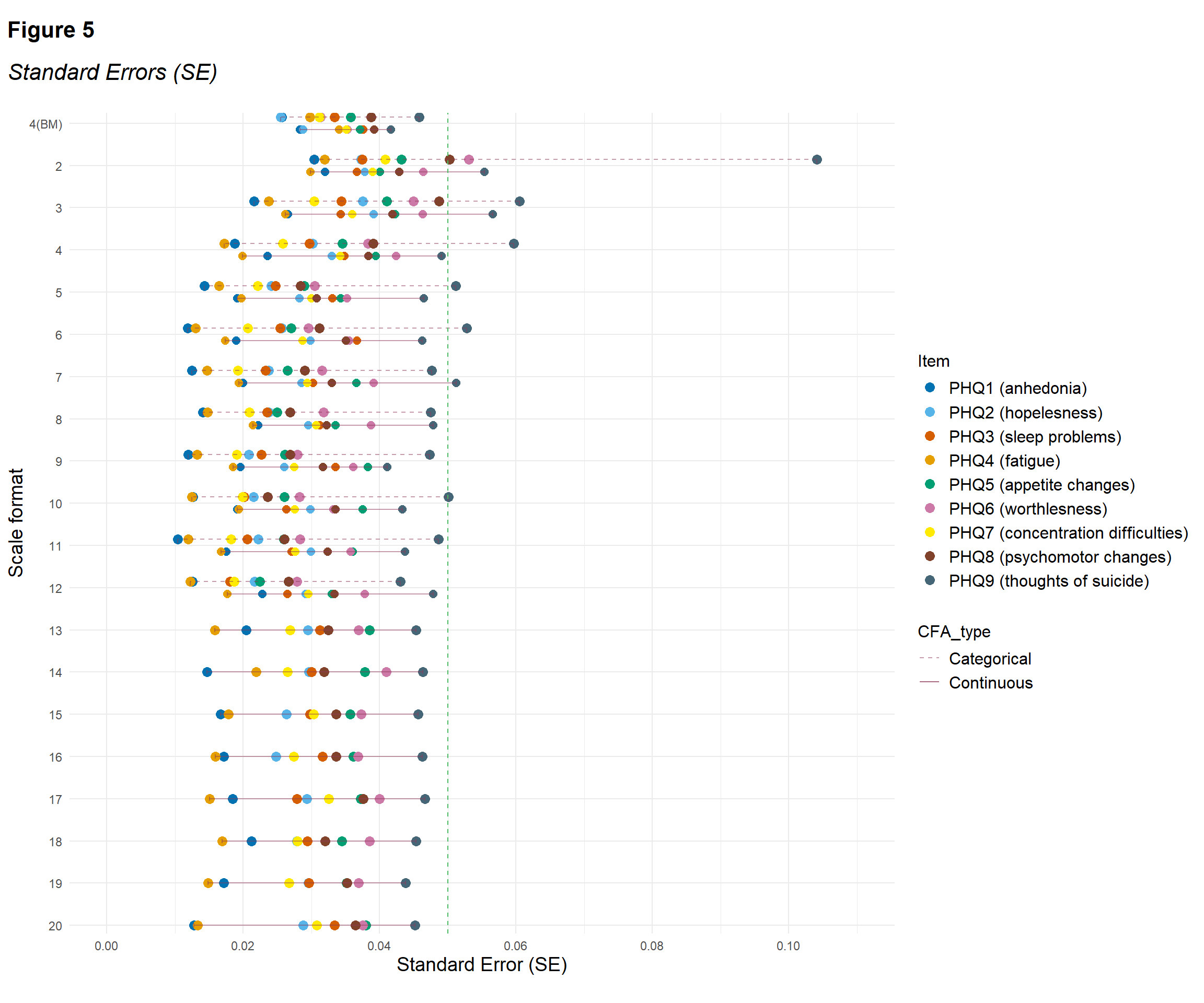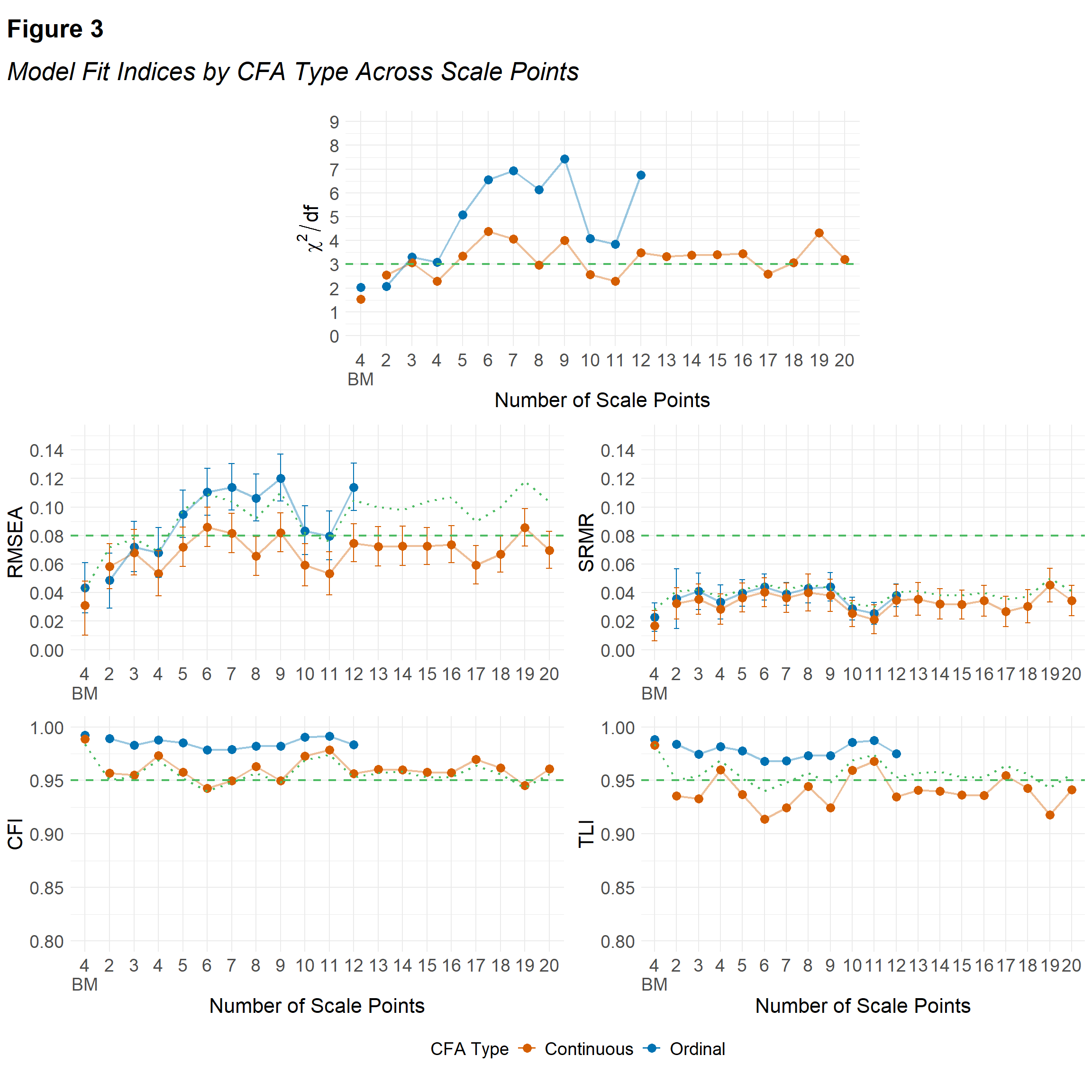 Figure 3 presents model fit indices for one-factor CFA models of the PHQ-9 across varying response scale widths, comparing ordinal and continuous estimation approaches. The chi-square/df ratios (top panel) reveal divergent patterns between estimation methods. Ordinal CFA models demonstrate a pronounced curvilinear relationship with scale granularity, with better fitting values at baseline and for scales with 2-4 points, followed by increase in index value for scales with 6-9 points (exceeding 6.0), and subsequent improvement for scales with 10 ad 11 points. In contrast, continuous models display more stable chi-square/df values across all scale points, generally remaining below or slightly above the conventional threshold of 3.0, with more pronounced elevations for scales with 5-7, 9 and 19 points. RMSEA values, being the chi-square based estimate, mirror the pattern observed in chi-square/df ratios for ordinal models, showing a marked increase for scales with 6-9 points (exceeding .10) before improving at 10 and 11 scale points. Continuous models demonstrate more stable RMSEA values, though scales with 6-7, 9 and 19 points show elevations slightly above .8. Confidence intervals for RMSEA are notably wider for ordinal models with mid-range scale points, indicating less precision in fit estimation. SRMR values remain consistently low across all scale points and both estimation approaches. Ordinal models display slightly higher SRMR values for scales with 6-9 points, but the differences between estimation methods are the least pronounced for this index compared to others. Comparative fit indices (CFI and TLI) remain consistently high across both estimation approaches. with CFI values exceeding acceptable thresholds (>.95) for most of the response scale widths, with 6, 7 and 19 scale points slightly below the threshold. TLI values remain above .95 using ordinal CFA approach for all of the points assessed, while they remain above .90 using estimator for continuous data, with 4, 10-11 and 17 scale points surpassing .95 value. Ordinal models consistently yield marginally higher CFI and TLI values compared to their continuous counterparts, particularly at mid-range scale points.