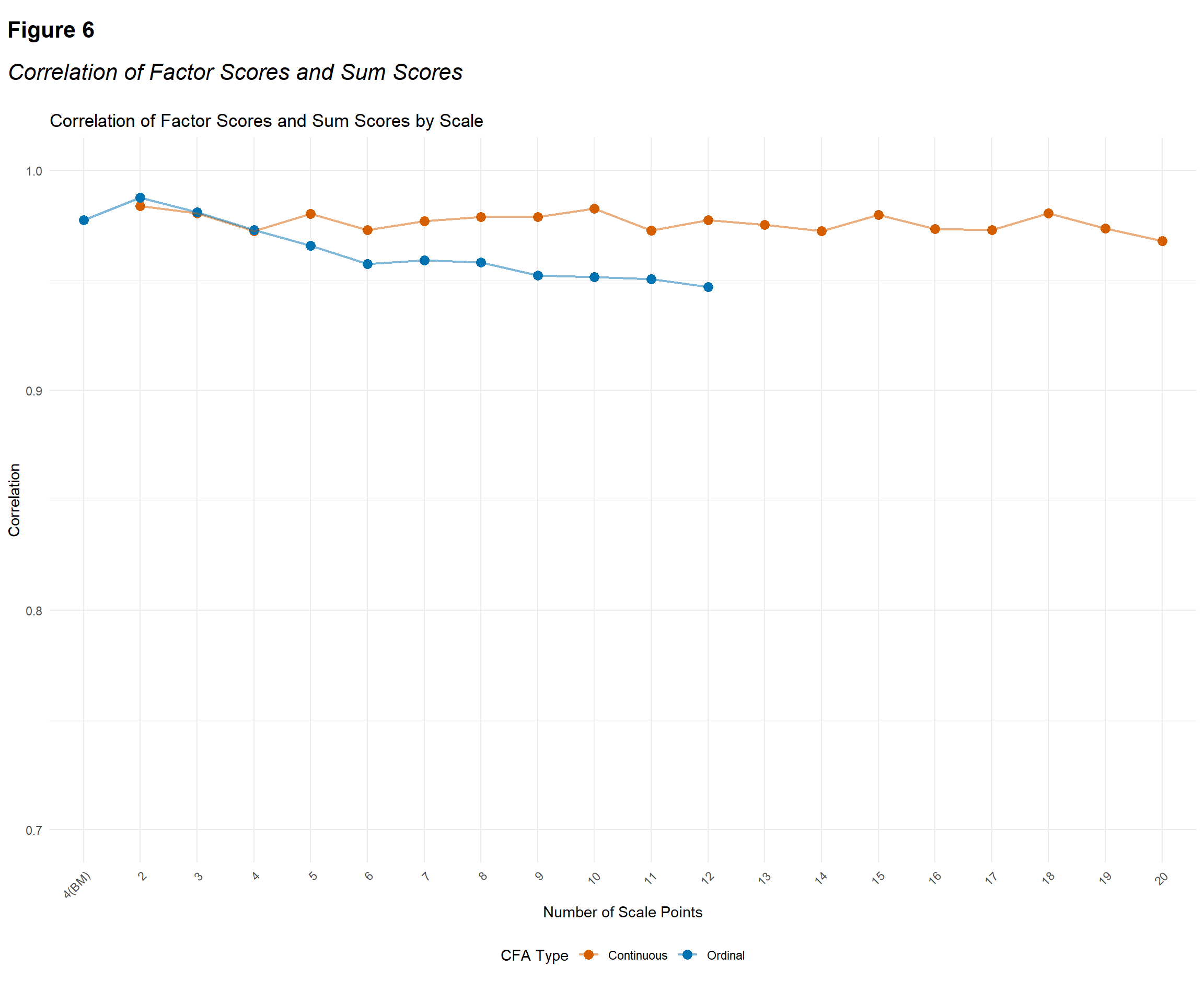 Figure 4 presents standardized parameter estimates for the modified one-factor PHQ-9 model. Overall, estimates tend to be slightly higher for scales with 5 or more response options compared to those with narrower formats. The most pronounced difference between categorical (DWLS) and continuous (MLR) estimation methods appears in the loading of the thoughts of suicide item, which consistently shows a lower loading of around 0.4 under MLR. For the remaining items, loadings estimated with both methods become relatively stable from 5 points onward, typically ranging between 0.6 and 0.9, with slightly lower values observed for 2- to 4-point scales. A similar pattern is evident in the standard errors of the standardized loadings (Figure 5), which tend to decrease from 2 to 5 scale points and then stabilize. Finally, Figure 6 compares correlations between estimated factor scores and participant sum scores across both estimation methods. While MLR-based estimates show consistently high correlations (approximately 0.98), a visible decline in correlation is observed for DWLS estimates.
