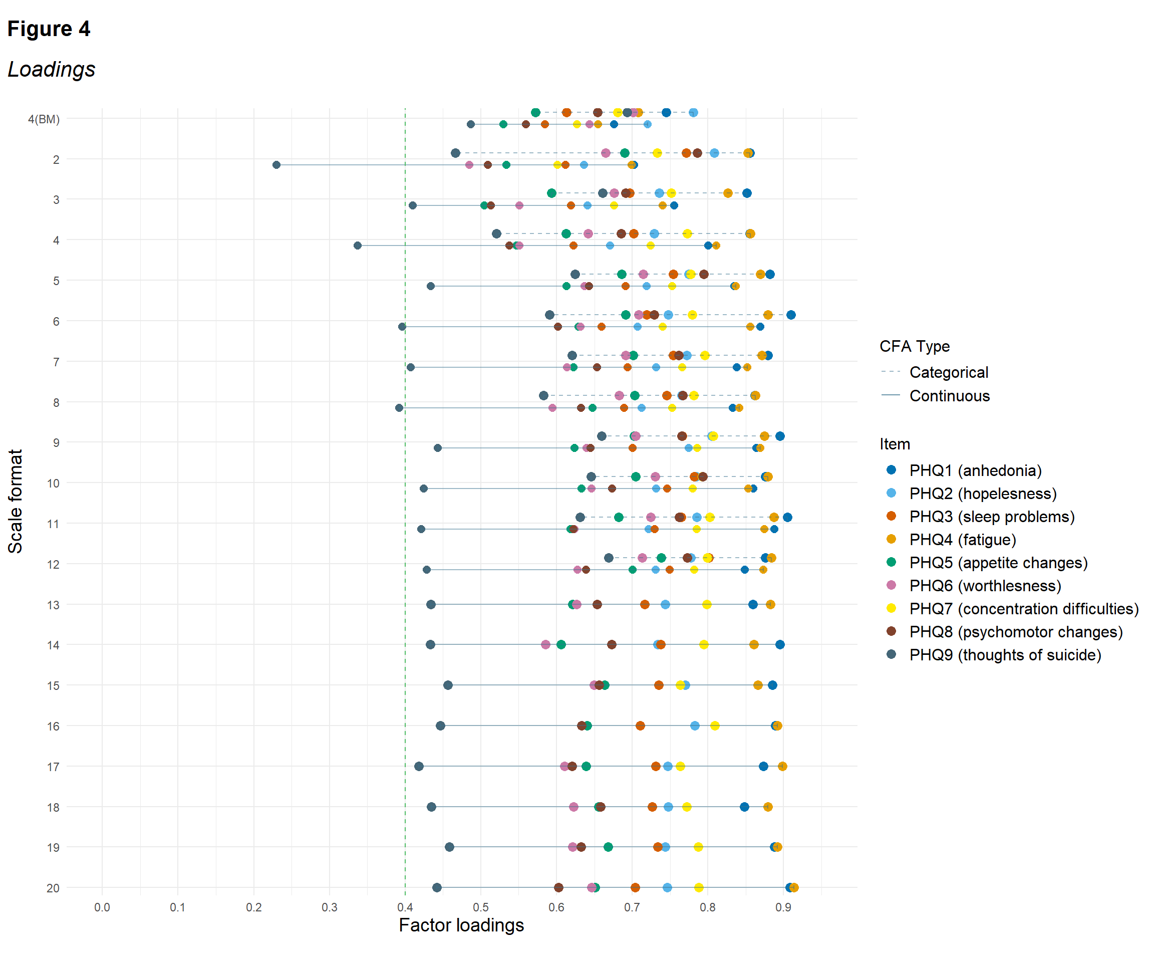 Internal structure of the instrument was examined using CFA analysis, where we tested the one-factor model of the PHQ-9 with a diagonally weighted least squares estimator for the 2-12 scale points and using MLR estimator for the entire span of the response scale widths examined. We used the following fit indices to assess the model fit: chi-square/df ratio, RMSEA, CFI, TLI, and SRMR. Following recommendations of Abulela & Khalaf (2024) and Shi et al. (2021), we examined parameter estimates, i.e. standardized factor loadings and the corresponding standard error estimates of the final solution.