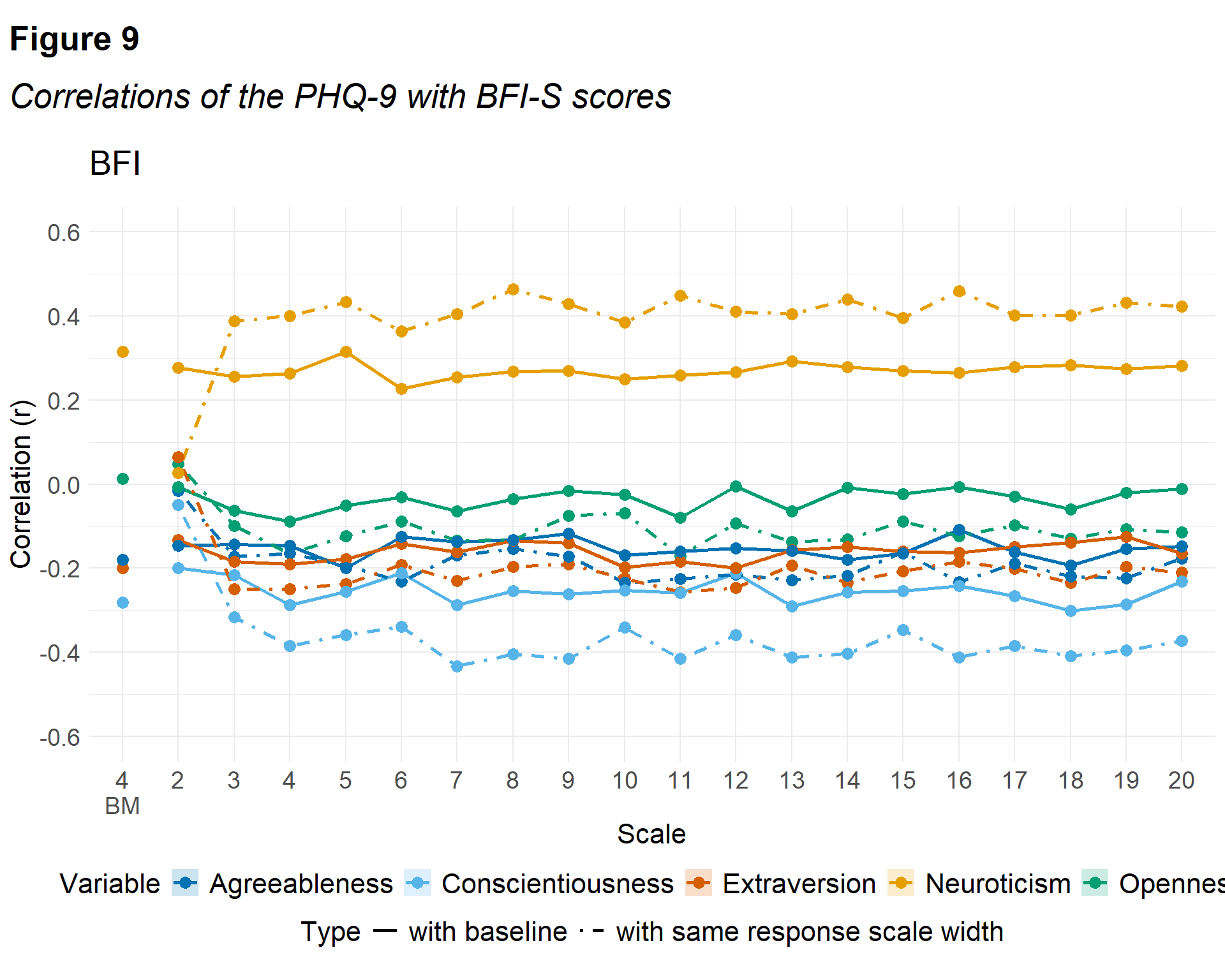 Figure 9 presents the relationships between PHQ-9 and the Big Five personality dimensions as measured by the BFI-S across different measurement conditions. The figure captures baseline correlations, correlations between PHQ-9 with varying scale points and baseline BFI-S scores, and concurrent correlations where both measures employed identical response scale widths.