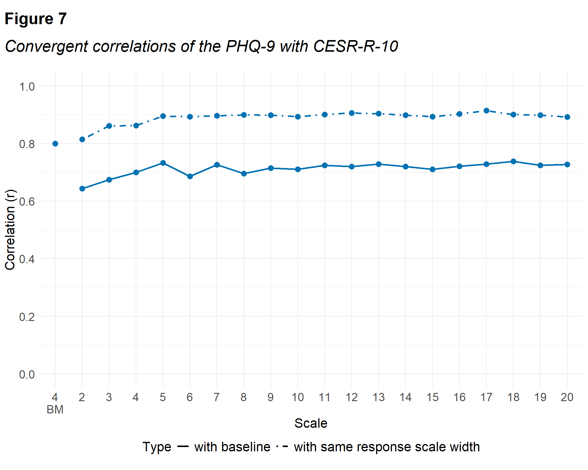 Figure 7 correlations displays correlations between PHQ-9 and CESD at baseline, as well as correlations between PHQ-9 measurements with varying scale points and CESD-R-10 at baseline, and concurrent correlations where CESD-R-10 was assessed using the same response scale width simultaneously. The correlation between PHQ-9 and CESD at baseline measurement was 0.80. Average correlations between PHQ-9 scores using variable-width response scales and baseline CESD-R-10 measurements were 0.71, lower than the baseline correlation—an expected finding given that fluctuations in depression symptomatology can occur within measurement timeframes. Notably, concurrent correlations between PHQ-9 and CESD-R-10 scores obtained using identical response scale widths at the same measurement point yielded a correlation of 0.89,exceeding the baseline correlation. Our analysis revealed a modest positive trend in correlations as response scale points increased from 2 to 5, after which correlations stabilized and remained relatively constant across higher numbers of scale points.