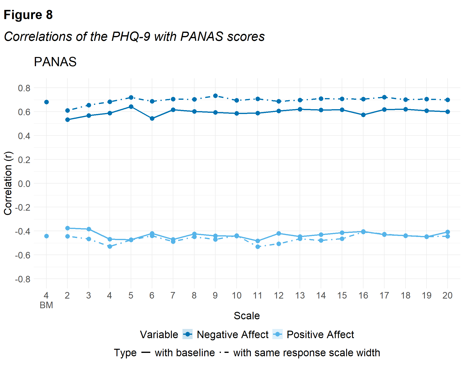 Figure 8 illustrates the relationship patterns between PHQ-9 and the Positive and Negative Affect Schedule (PANAS) components across different measurement conditions. This figure presents baseline correlations, correlations between PHQ-9 with varying scale points and PANAS scores measured at baseline, and correlations where both instruments were administered concurrently using identical response scale widths. The PHQ-9 showed a substantial positive correlation of 0.68 with PANAS negative affect at baseline, while exhibiting an inverse relationship of -0.44 with PANAS positive affect. These bidirectional associations align with theoretical expectations regarding depression’s relationship with affective states as well as with empirical findings (ADD REFERENCE). When examining PHQ-9 scores using variable-width response formats against baseline PANAS measurements, correlations averaged 0.60 for negative affect and -0.43 for positive affect, reflecting modest reduction in association strength for negative affect, but with no changes for positive affect. When both instruments were administered simultaneously using matched response formats, the associations of PHQ-9 with negative affect were at the level measured at baseline with an average correlation of 0.70, while PHQ-9’s relationship with positive affect stayed unchanged again with the correlation of -0.46. The figure additionally reveals that correlation magnitude shows initial sensitivity to scale granularity between 2-5 points for negative affect, and for 4 points compared to 2 and 3 points before stabilizing across wider scales, suggesting that response formats with at least 4 points adequately capture the relationship between depressive symptoms and affective states.