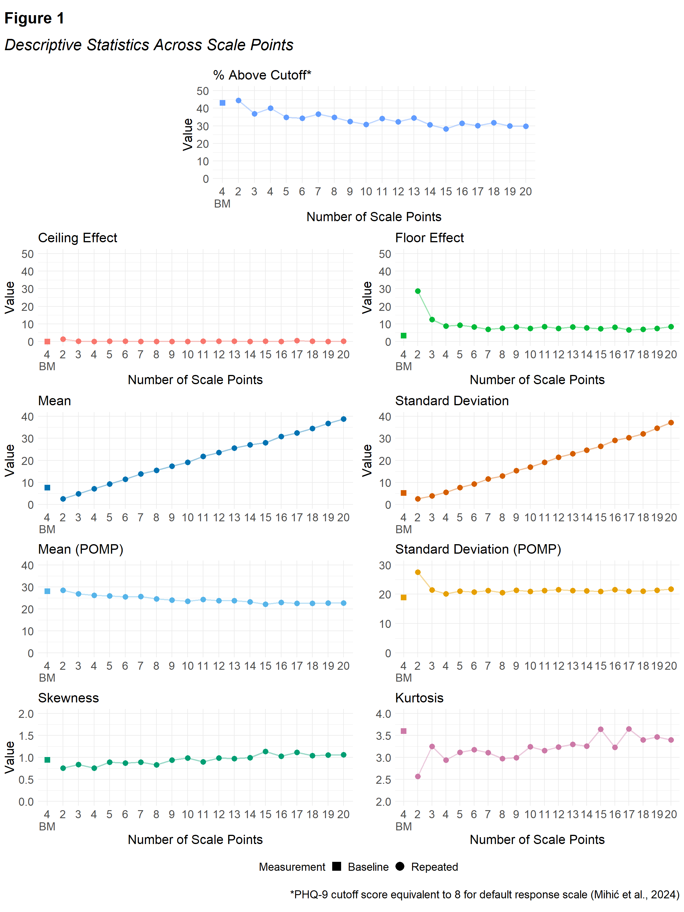 To assess distributional properties, we examined the ceiling and floor effects calculating the proportion of respondents receiving minimum and maximum possible score across the range of response scale points assessed, as well as the number of participants scoring above cutoff for each response scale condition, where the PHQ-9 cutoff score of >= 8 (Mihić et al. (2024)) was used. To ease comparison between varying PHQ-9 response scale widths, we converted sum scores and cutoff score to the Percentage of the Maximum possible scores (POMP; Cohen et al. (1999)) by dividing the difference between observed and minimum score by the difference between maximum and minimum score and multiplying the division result by 100. Then we tested for the trends in the POMP mean scores, skeweness and kurtosis using polynomial ANOVA.