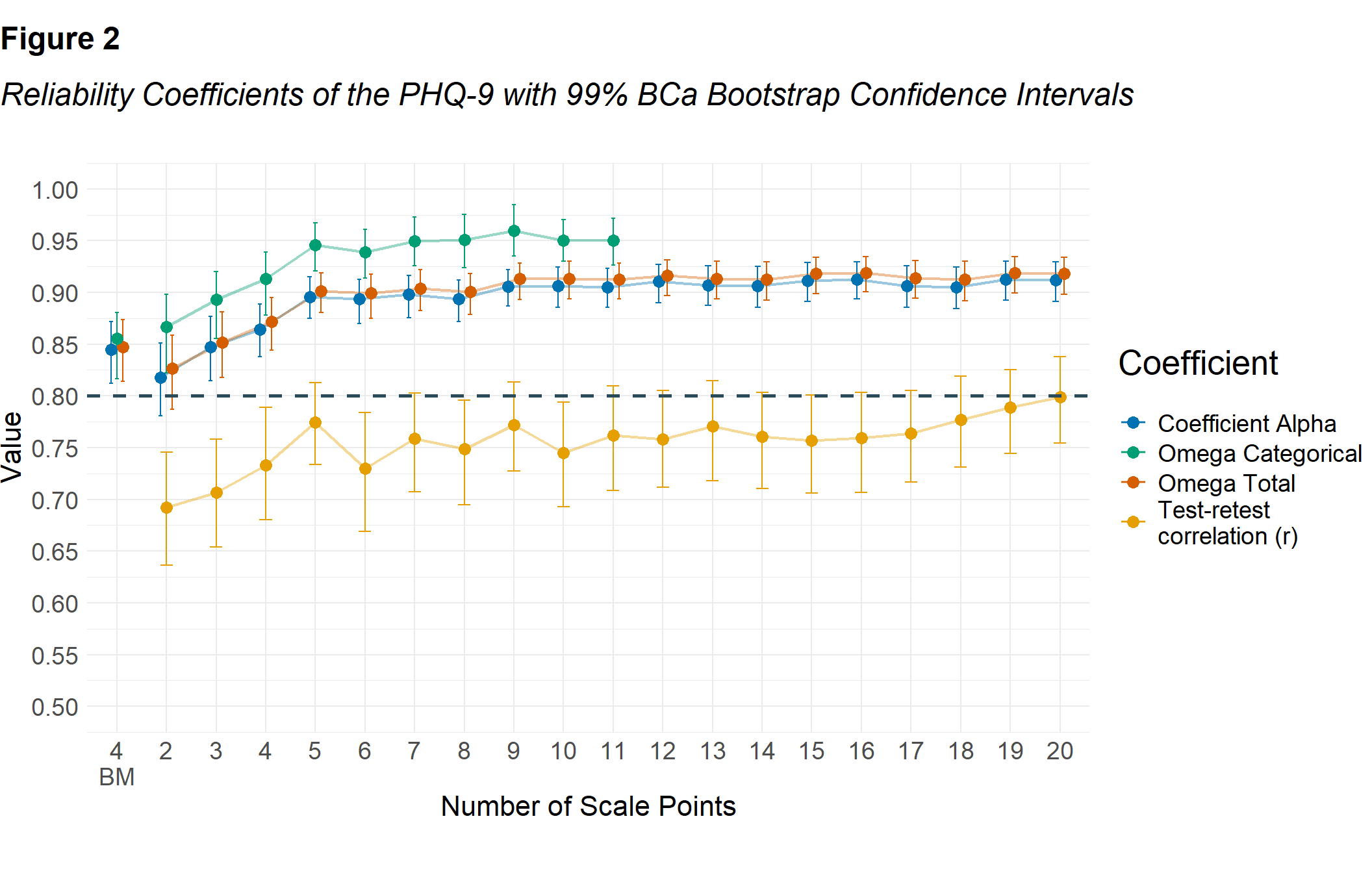 Reliability of the PHQ-9 was assessed using three commonly used coefficients: Cronbach’s Alpha, McDonald’s Omega Total, and Omega Categorical. We calculated the coefficients for each response scale width and compared the results across the range of scale points. We used the 99% BCa bootstrap confidence intervals to assess the precision of the reliability estimates. Test-retest reliability was calculated using the Pearson correlation coefficient between the baseline PHQ-9 scores and the scores obtained with the same response scale width in the last measurement. Additionally, intraclass correlation coefficient as a measure of test-retest reliability was calculated between baseline and repeated 4- point PHQ-9 scales.